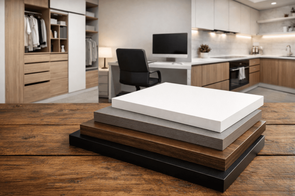 Tablero recubierto con una capa decorativa impregnada con resinas melamínicas, que ofrece una superficie resistente, uniforme y de fácil mantenimiento.Se distingue por su amplia variedad de diseños y colores, así como por su resistencia al desgaste, humedad moderada y uso diario, siendo ideal para proyectos funcionales con acabados modernos y consistentes.